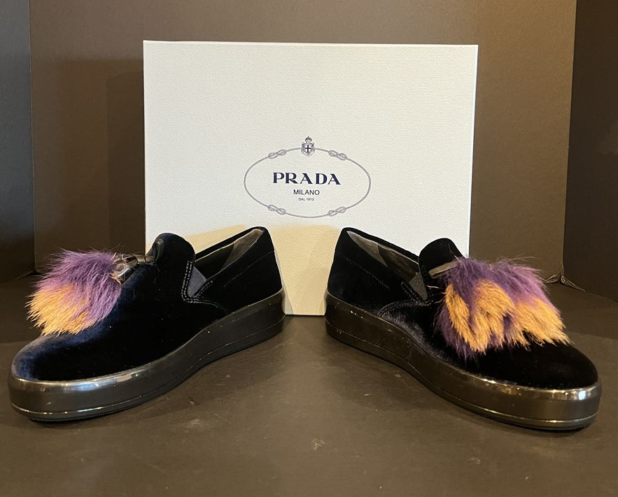 Looking for a fun pair of loafers to add to your accessories? These NWT Prada black Velvet loafers would be perfect and feature a fun tassel as a statement. Find these and more great designer shoes at Consigning Women and consigningwomyn.com